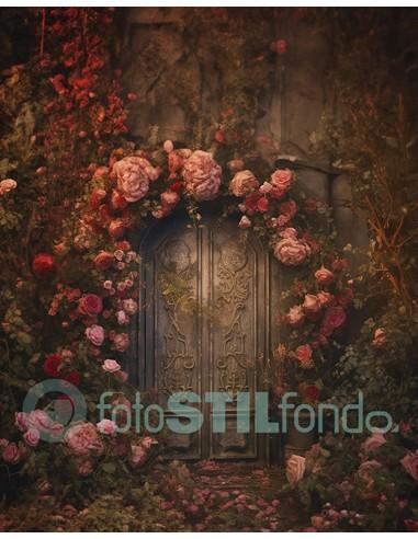 Puerta en tonos marrones rodeada de flores. Fondo disponible en calidad lienzo, totalmente mate y disponible en distintos tamaños.